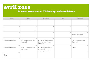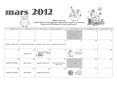 Voici le calendrier des activités du mois de mars pour la classe. Une copie vous sera envoyée ce lundi dans l'agenda de votre enfant. Veuillez s'il-vous-plaît y ajouter les informations suivantes: