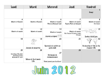 Voici le calendrier du mois de février préparé par Margo, la maman de Mykaela. Si vous avez un empêchement quelconque ou si encore vous aimeriez vous ajouter à cet horaire, n'hésitez pas à me le faire savoir. Dans ce cas, une simple note dans l'agenda de votre enfant serait appréciée.